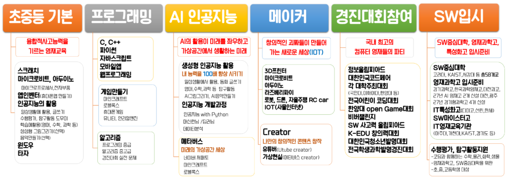 초중등 기본과정, 경진대회준비, 입시준비(영과고, 영재교육기관, IT특성화고등학교, SW중심대학),