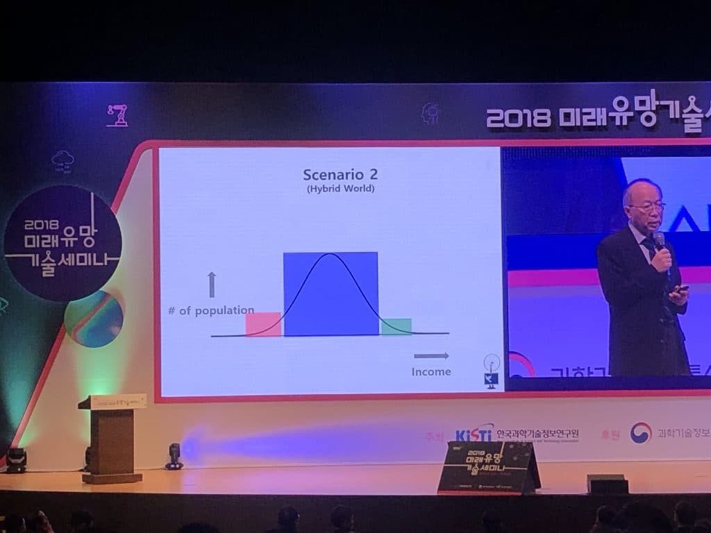 첫번째 강연이었던 “마지막 산업혁명” 에서는 국가과학기술연구회 원강연 이사장이 산업혁명의 전반적인 얘기와 4차 산업혁명 의 기수적인 핵심 그리고 인간의 롤(Role), 정부의 역할 등을 다루었다. 원강연 이사장에 따르면 4차 산업혁명의 기술적인 핵심에는 크게 세가지로 나뉘어 질 수 있다. 이에는 이제까지는 데이터 가 목적어의 개념을 이루고 있었지만 이제 그 의미가 주어의 성격을 띄는 형태로 바뀌어 가는 정보의 주체화, 데이터가 물질에 스며들어 자아까지는 아니지만 비슷하게 전개가 되어 가고 있다는 물질의 반격, 사람이 데이터를 다루었다면 이제 데이터가 사람을 다루게 된다는 주객의 전도 가 있다. 원강연 이사장은 “인간은 전세계의 컴퓨터를 네트워크(인터넷) 으로 연결을 했고, 이제 이 네트워크는 사람들을 연결시키고 있다.” 라고 말했다. 여태까지는 우리가 데이터를 이용해서 무엇인가를 유추해 내고 사용을 했다면, 이제는 이 데이터가 모여 사람을 다룬다. AI 의 비약적인 발전으로 인해 컴퓨터가 자율성을 띄고 인간에게 다가오고 있는게 우리가 사는 현실이다. 원강연 이사장은 또 한 1차 에서 4차 산업혁명에 이루기까지 산업혁명은 “인간과 기계의 Interaction(상호관계)” 라고 설명하며 1차 산업혁명에서는 기계가 Factory(공장) 에서, 2차 산업혁명은 전기 가 BattleField(전쟁) 에서, 3차 산업혁명은 디지털이 Capitalism(자본주의) 에서 그리고 4차 산업혁명은 하이브리드 Democracy(민주주의) 에서 인간과 상호관계를 가졌고, 우리와 근접해 있는 4차 산업혁명에서는 인간이 크게 세가지 부류로 나뉠수 있다 라고 얘기한다. 1. 기계가 할 수 있지만 싫어하는 일을 해야 하는 사람들을 하층, 기계를 소유한 사람들이 중상 층에 그리고 기계가 하지못하는 것을 할 수 있는 사람들을 상류 층에 나누었다. 그리고 상층과 하층에 분포되어 있는 사람의 비율은 비교적 적고 기계를 소유한 사람들 부류에 해당 되는 사람들이 많은 Normal Distribution (정규분포) 형태를 띄어야 한다고 했다. 하지만 기계를 소유한 사람들이 정규분포의 형태를 띄기 위해서는 그에 걸맞는 교육과 정부의 역할이 필요하다 라고 주장했다. 정부는 기계가 할 수 있지만 싫어하는 일을 해야 하는 사람들을 복지로 보호해주고, 기계가 하지 못하는 것을 하는 사람들이 탐욕적으로 변하지 않도록 Regulation(규제) 를 통하여 제어해야 하지만 정부의 역할은 극히 제한적이라고 주장했다. 또 한, 혁명적인 기술 혁신은 매년, 매월이 아닌 매일 일어날수 있으며 이는 Discrete(비연속적) 으로 다가오지 않고 Continous(연속적) 하게 다가올것 이라고 했다. 마지막으로 미래에는 기계가 인간보다 Powerful(강력)하고 Smart(영리)해 질 것 이라며 강연을 마무리 했다.