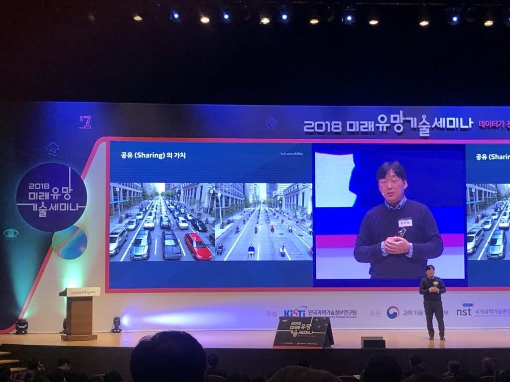 지난 3년 6개월간 자신들의 서비스인 카카오택시, 카카오 네비, 카카오 대리, 카카오 주차 등을 이용해서 35억 건의 이동이 있었다고 한다. 정주환 대표 본인은 “ ‘이동’의 본질은 ‘생활의 연결’” 이라고 주장했다. 사람이 이동하는데 있어서는 비즈니스 미팅이 있다던가, 친구를 만난다던가, 가족을 만나는 등의 우리의 생활이 밀접하게 작용한다고 했다. 그리고 앞으로 이동수단의 개념이 “소유” 의 의미에서 “공유” 의 의미로, 거점기반의 이동에서 거리의 개념으로 그리고 계획적인 이동에서 필요에 의한 이동 으로 변화 한다 라고 했다. 그리고 이를 자동결제, 지도 데이터, 스마트 모빌리티, 모바일 그리고 인공지능이 가능하게 기술적으로 뒷받침 해준다고 했다. 이에따른 스마트 모빌리티의 특징으로 실시간 데이터가 실시간으로 데이터를 주고 받기 때문에 위치기반으로 슈요에 따른 공급을 제공할수 있다고 말했다. 이에대한 예시로 실제 강남에서 카카오택시 이전에 택시를 잡아 타는 지역이 큰 길가로 많이 분포 되어 있었다 한다면, 카카오 택시의 출시와 함께 사람들의 택시 출발 지역이 큰 도로변에서 자신의 집앞 으로 이동했다 그리고 이는 실시간 데이터가 있었기에 가능하다 라고 말했다. 정주환 대표가 말한 가장큰 변화는 자가용이 사유재산인 소유의 본질을 띄고 있었지만, 이제는 카 쉐어링을 통한 공유의 모양을 띈다고 말했다. 그리고 실제로 미국에서 Uber 라는 스마트 모빌리티 시스템이 시가총액 130조를 자랑하며 이는 미국의 빅3 자동차 회사를 합친것 보다 크다며 이를 뒷바침 했다. 또한 정주환 대표는 플랫폼을 통해서 다양한 이동 수요를 연결하는 이동서비스가 등장 했으며, 다양한 NEEDS(필요)를 충족시켜 줄 수 있다고 말했다. 그 예를 들어 Pet Taxi (반려동물 을 태울수 있는 택시) 와 어린 아이를 뒤에 태우기 위한 카시트가 준비되어 있는 택시를 말했다. 기존에는 일반 택시에 어린아이를 태울수 있는 카시트가 존재 하지 않고, 반려동물을 같이 태울수 있는 택시 라는 분류가 없었지만 스마트 모빌리티 시스템은 이를 충족 시켜줄수 있다고 했다. 또 한 그는 이동 수단에 자가용, 대중교통만 있는 것이 아닌 소형 전동기를 얘기했다. 요새 큰 이슈가 되고 있는 전동 킥보드는 사람들을 간편하게 이동 시켜주는 교통 수단 이라고 주장했다. 그리고 그는 Smart Healthcare 와 Smart Farm 을 각각 Lunit(한국 스타트업 엑스레이 솔루션 회사)와 Cucumber sorting by Tensor Flow(Tensor Flow 라는 알파고에 이용된 인공지능을 이용해 오이를 분류를 자동화 하는 시스템)을 이야기 하며 Tensor Flow와 같은 클라우드 솔루션을 이용해 개인이 어렵지 않게 프로젝트를 진행하고 설치할수 있다 라고 말했다. 그리고 마지막으로 MONET (도요타와 SoftBank 의 합작으로 이동하는 피자 스토어) 와 같이 모빌리티가 단순 교통수단이 아닌 더 나아가 부동산을 대체할수 있다고 얘기했다.